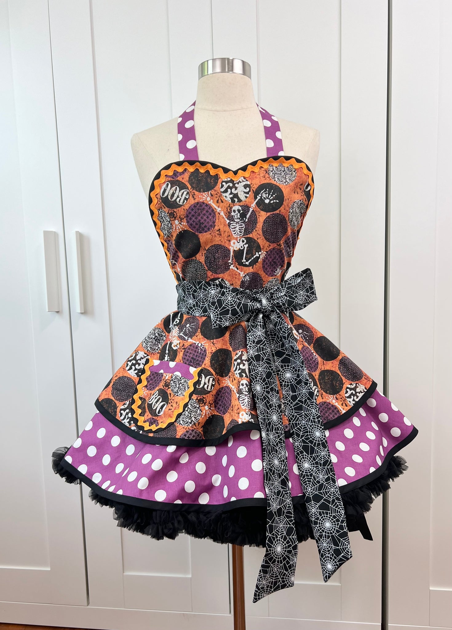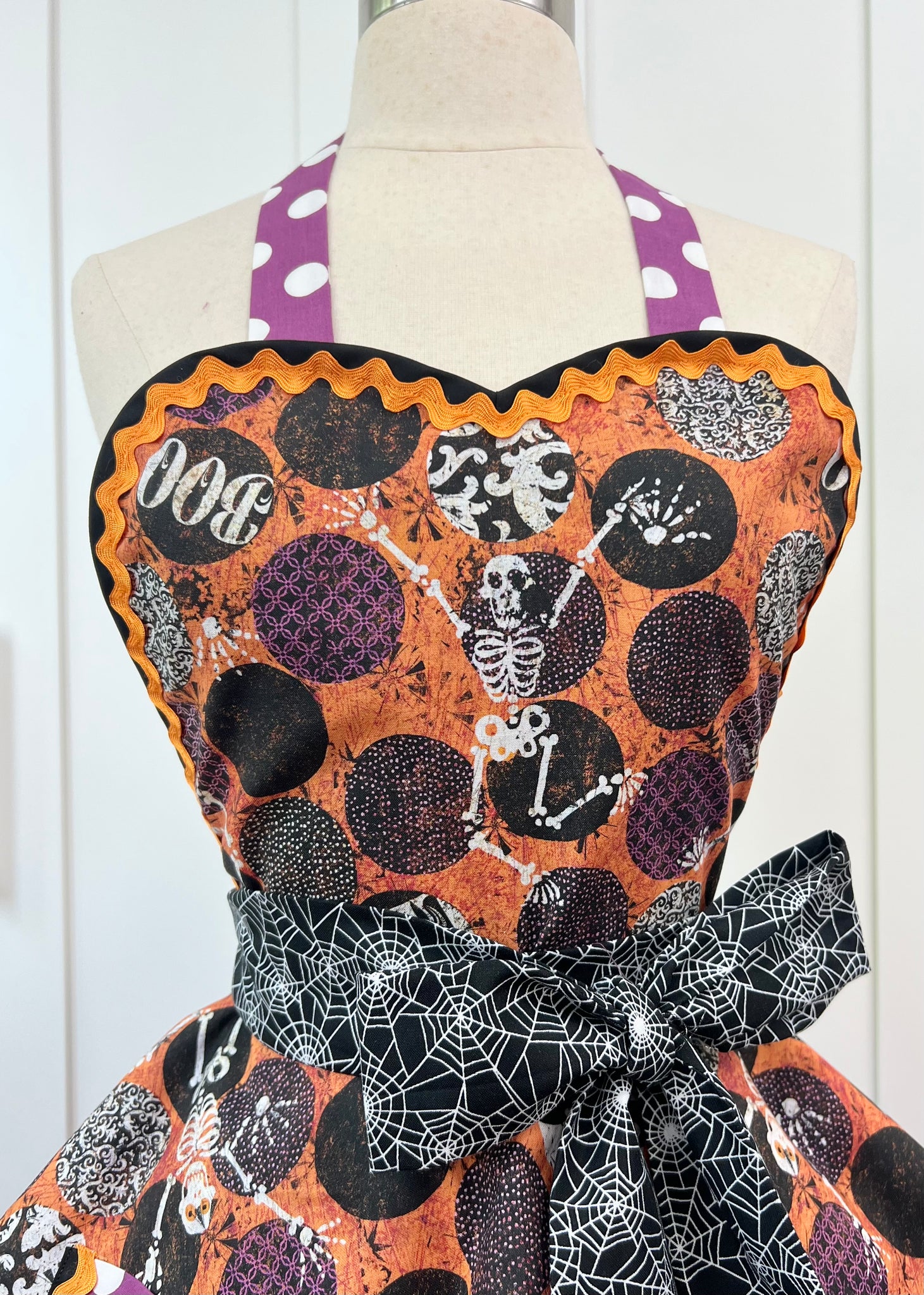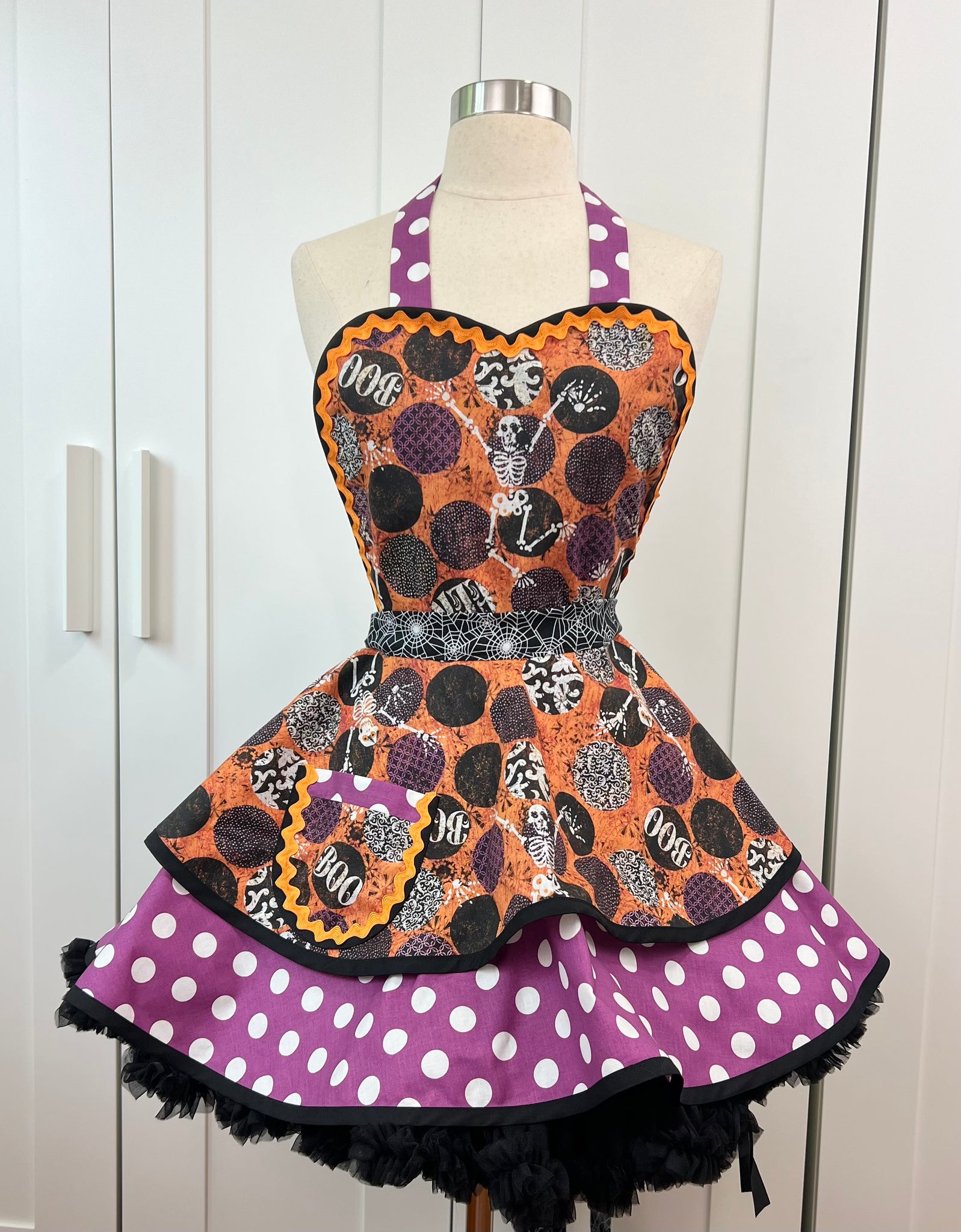 The bodice and top skirt feature dancing skeletons and colorful circles on an orange background. The bottom skirt and the neck bands are a purple and white polka dot print. The waistband and ties are a spider web print in black and white. The 2-tier circle skirt pinup design is very feminine and flirty and perfect for your Halloween party or to hand out candy to treat-or-treaters!