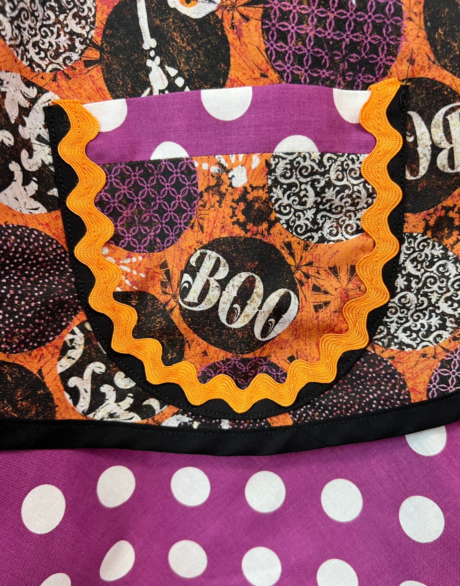 The bodice and single lined pocket are trimmed in black bias and edged with orange rack rack. The bodice is fully lined for extra durability and protection from spills. The neck straps are adjustable with a D-ring.